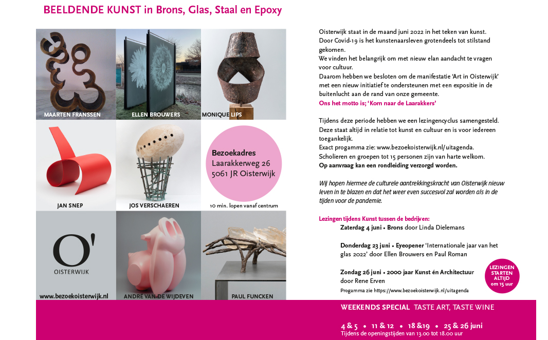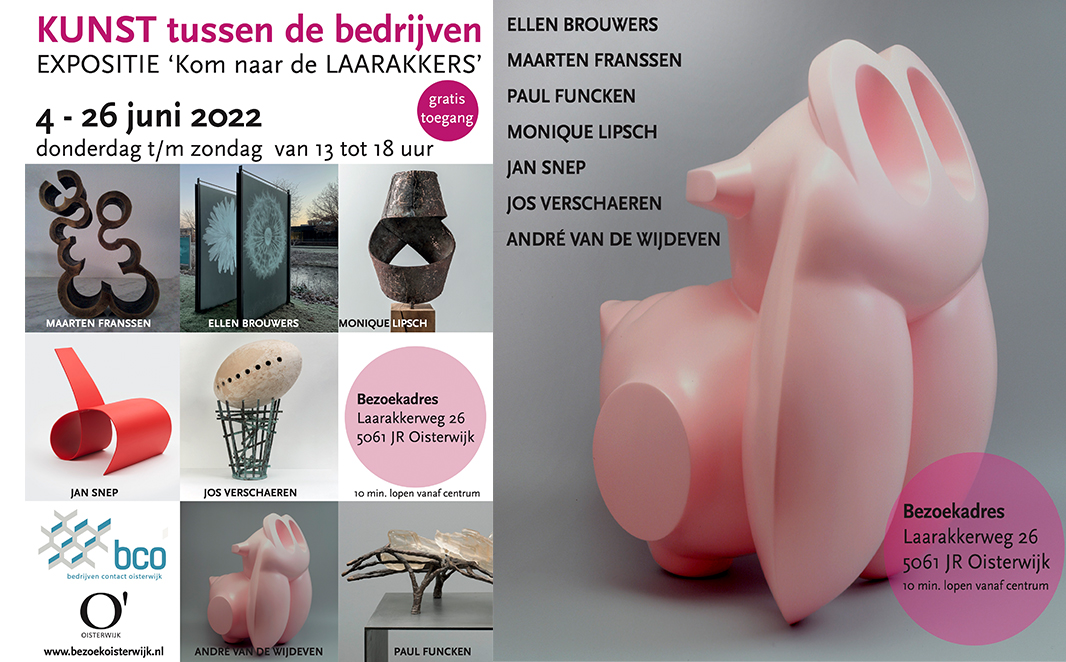 Eerste editie KUNST TUSSEN DE BEDRIJVEN 2022 4 juni - 26 juni 2022 do t/m zon 13 tot 18 uur. Oisterwijk staat in de maand juni 2022 in het teken van kunst. Door Covid-19 is het kunstenaarsleven grotendeels tot stilstand gekomen. We vinden het belangrijk om met nieuw elan aandacht te vragen voor cultuur. Daarom hebben we besloten om de manifestatie ‘Art in Oisterwijk’ met een nieuw initiatief te ondersteunen met een expositie in de buitenlucht aan de rand van onze gemeente. Ons het motto is; ‘Kom naar de Laarakkers’ Tijdens deze periode hebben we een lezingencyclussamengesteld. Deze staat altijd in relatie tot kunst en cultuur en is voor iedereen toegankelijk. Wij hopen hiermee de culturele aantrekkingskracht van Oisterwijk nieuw leven in te blazen en dat het weer even succesvol zal worden als in de tijden voor de pandemie. Deelnemende Kunstenaars 2022; Ellen Brouwers - Maarten Franssen - Paul Funcken - Monique Lipsch - Jan Snep - Jos Verscharen- André van de Wijdeven