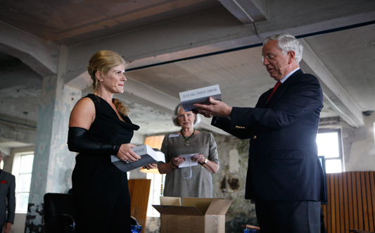 Uitreiking eerste exemplaar aan de Jan H.M. Hommen.