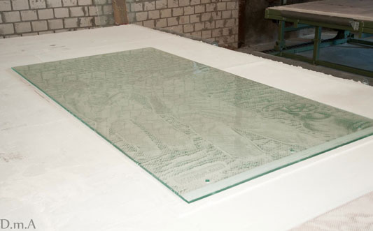 Het glas wordt gevormd door een speciaal brandings proces. Om het glas te vormen wordt van elk paneel een zeefdruk gedrukt op een keramische folie. Deze folie wordt vervolgens gezandstraald.