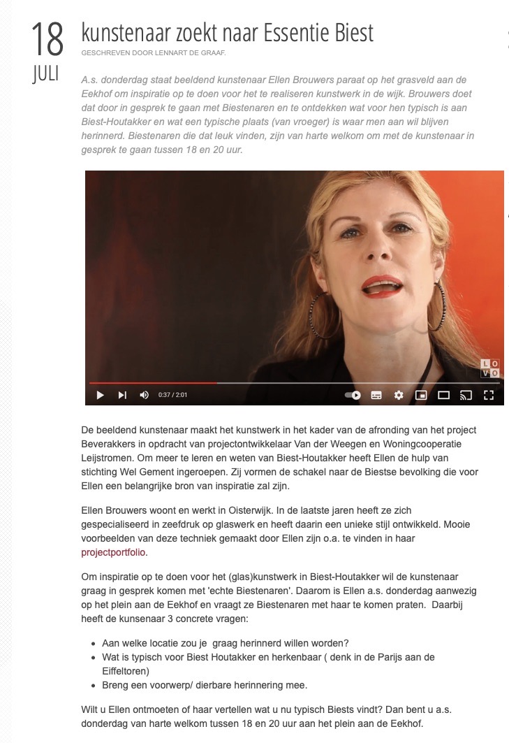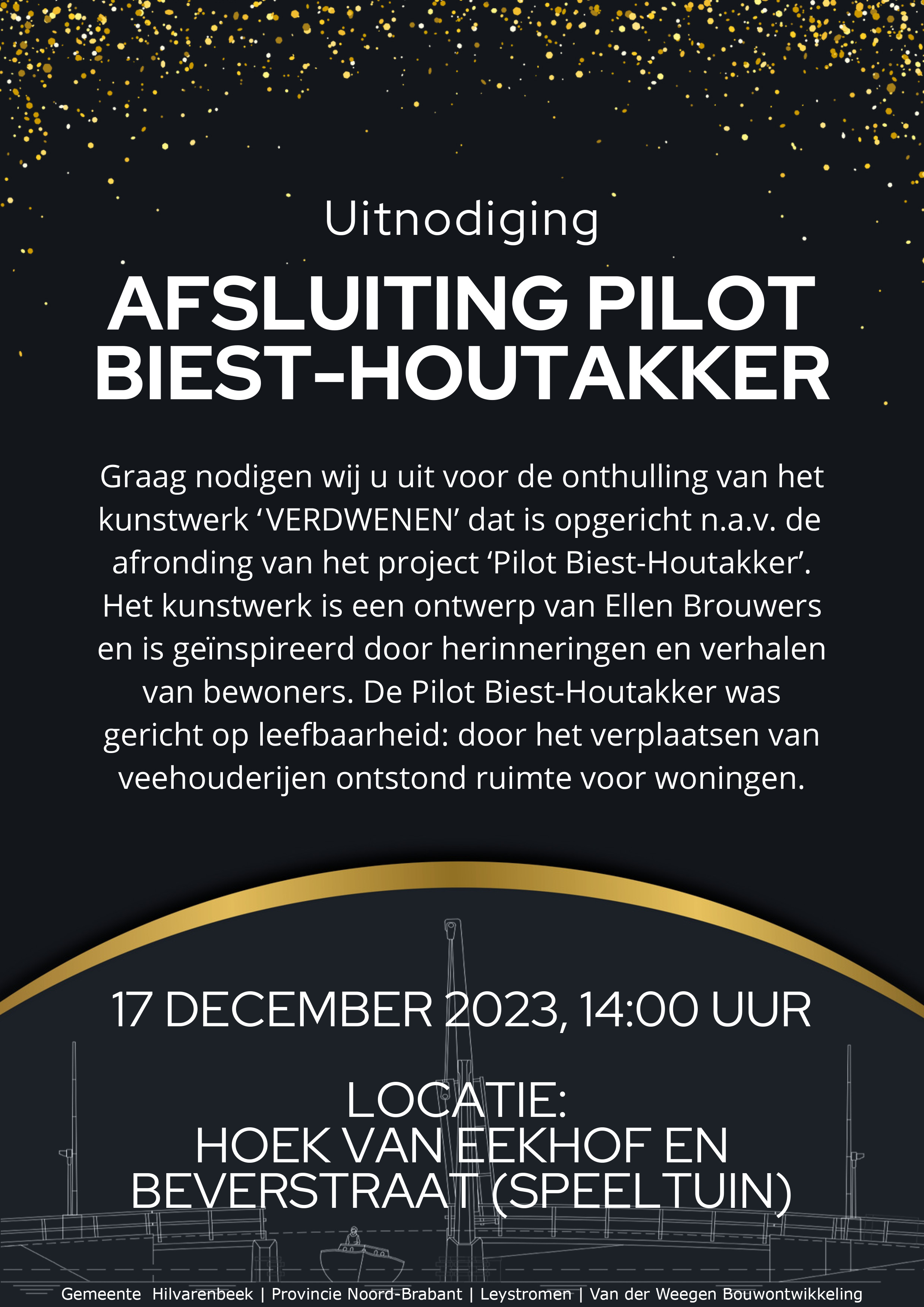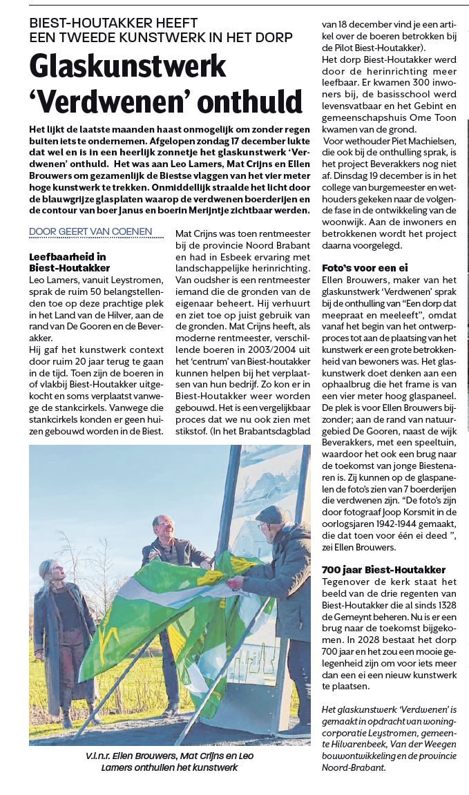 In Biest-Houtakker is afgelopen zondag 17 december 2023 een 4 meter hoog glaskunstwerk van Ellen Brouwers onthuld. De allereerste boerderij die werd opgekocht om plaats te maken voor Ruimte-voor-Ruimtewoningen in Brabant was niet alleen een primeur voor Biest-Houtakker. Het werd dé kans voor het dorp om vooruit te komen. Ruim 20 jaar later en 66 nieuwe woningen verder, wordt die kans gemarkeerd met een kunstwerk.