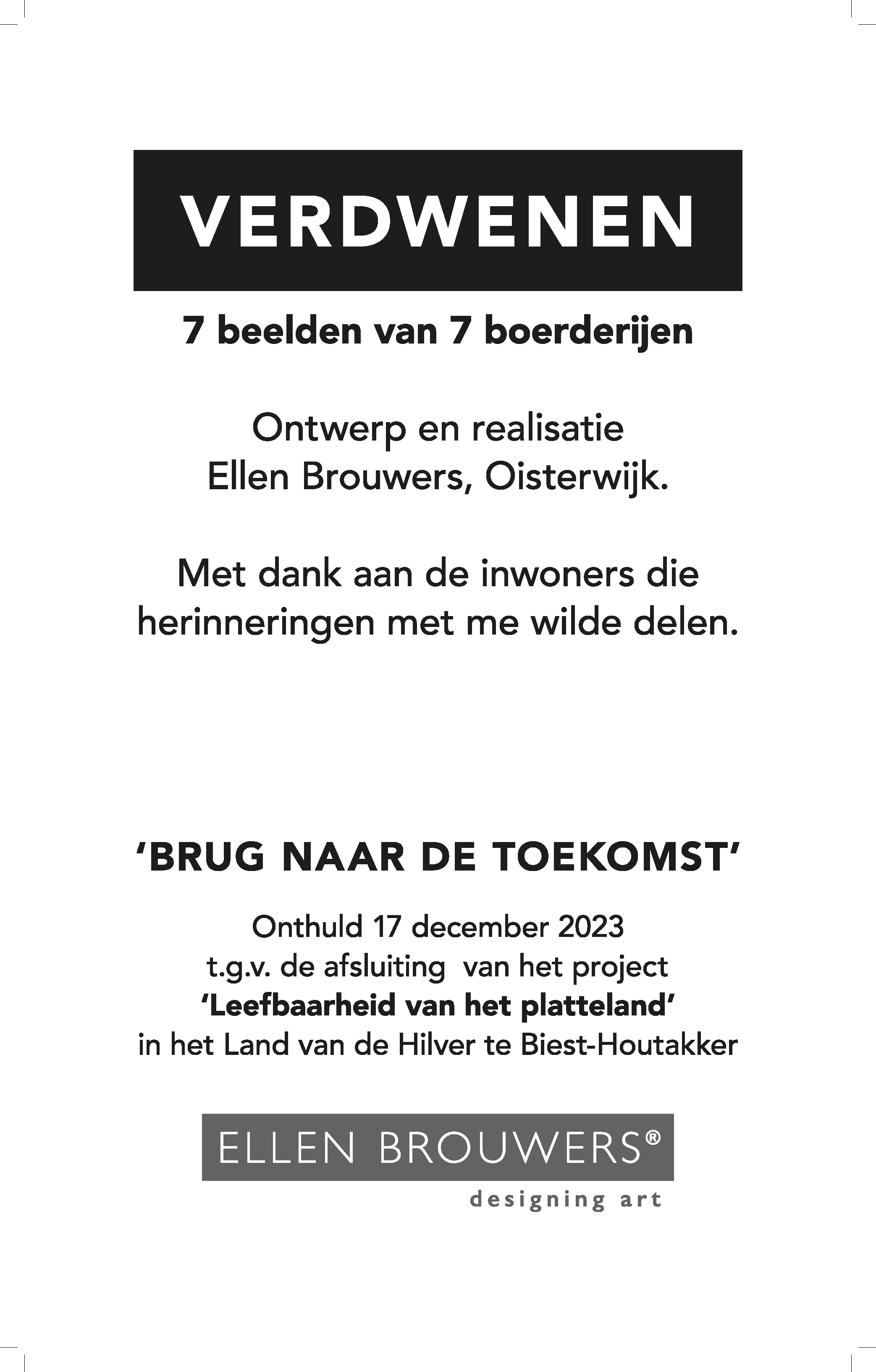Kunstwerk ter afronding van het project leefbaarheid van het platteland te Biest- Houtakker. 7 beelden van 7 boerderijen, geïnspireerd door herinneringen en verhalen van bewoners. Geplaatst op een speciale plek aan de rand van deze gemeente.